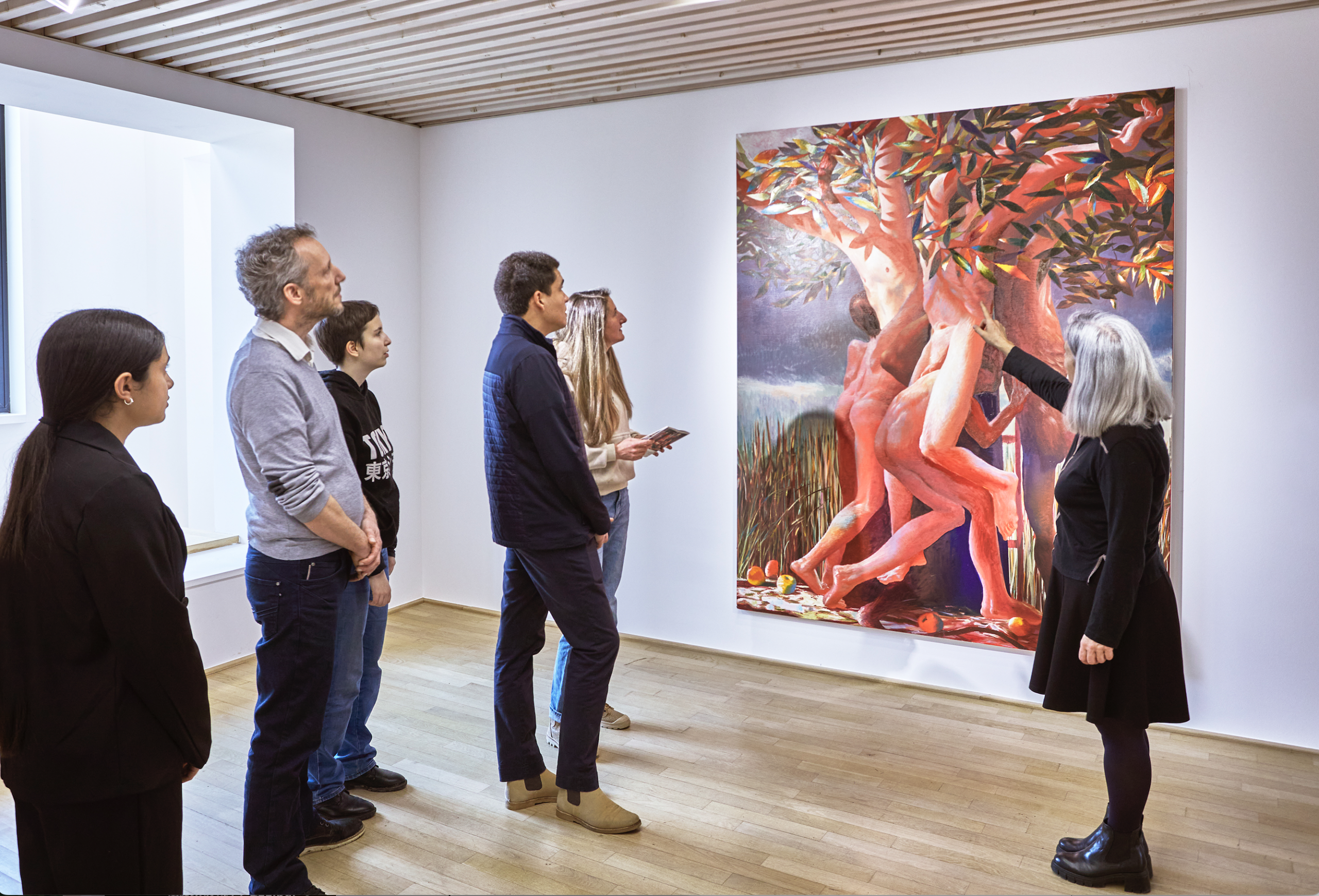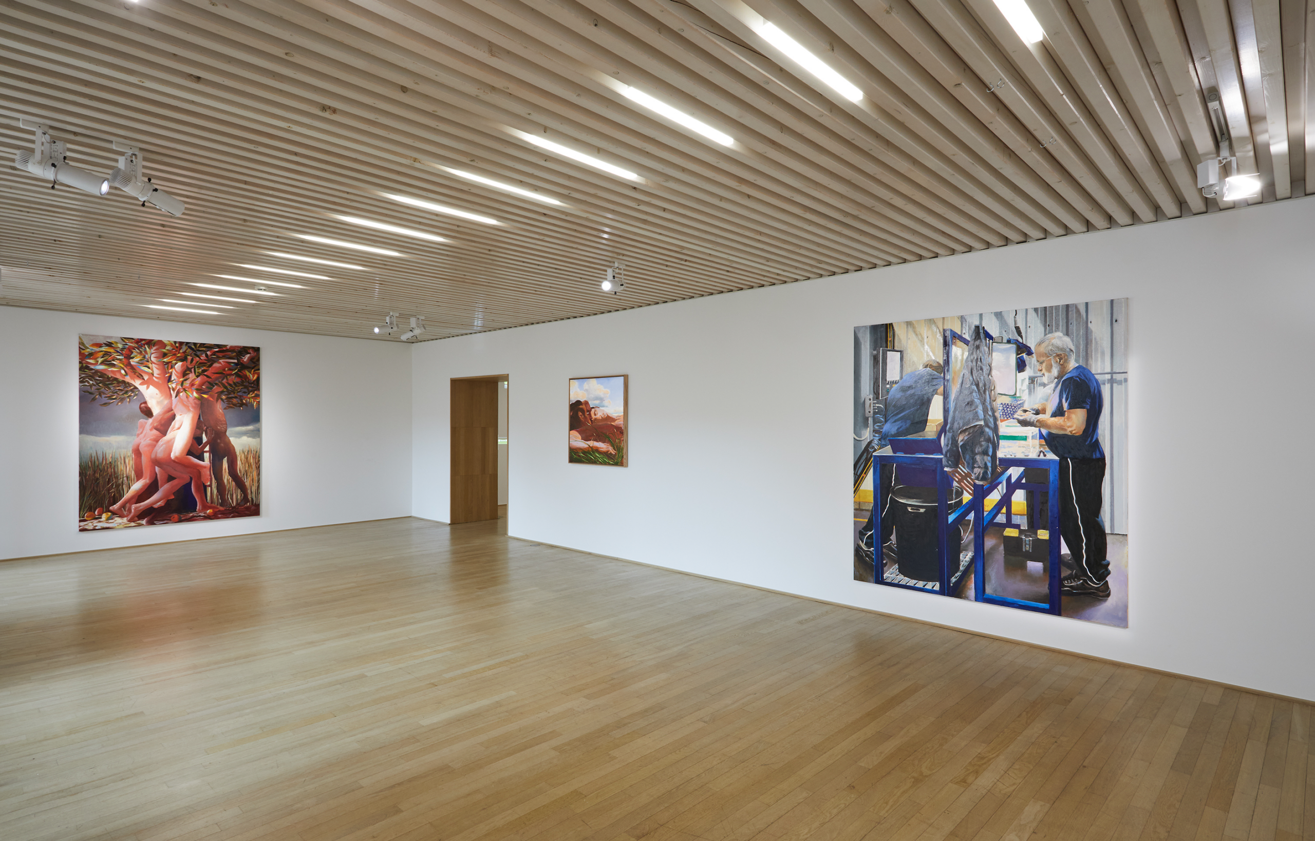 Ces œuvres sont présentées dans l’exposition aux côtés d’autres tableaux qui mettent aussi en scène des corps humains, mais dans des paysages naturels. Ces corps s’enlacent et s’articulent, tels des amoureux, des acrobates ou des pantins. Ces figures sont nées de l’imagination de l’artiste et de jeux de découpages qui lui servent à la composition du tableau. À l’opposé de l’espace fortement normé des ateliers de production qui demandent aux corps une constante mobilisation de leurs forces et une attention aux dangers, l’espace de ces œuvres est propice au relâchement, au repos, même à la transformation. Certains paraissent titanesques, tandis que d’autres ont leurs membres qui s’allongent, se prolongent en branche, se transforment en pattes, dans une étrange continuité entre l’humain, l’animal et le végétal. Ces corps libérés de toute assignation sociale, qui se rencontrent dans des paysages arcadiens, souvent irradiés par un soleil incandescent.