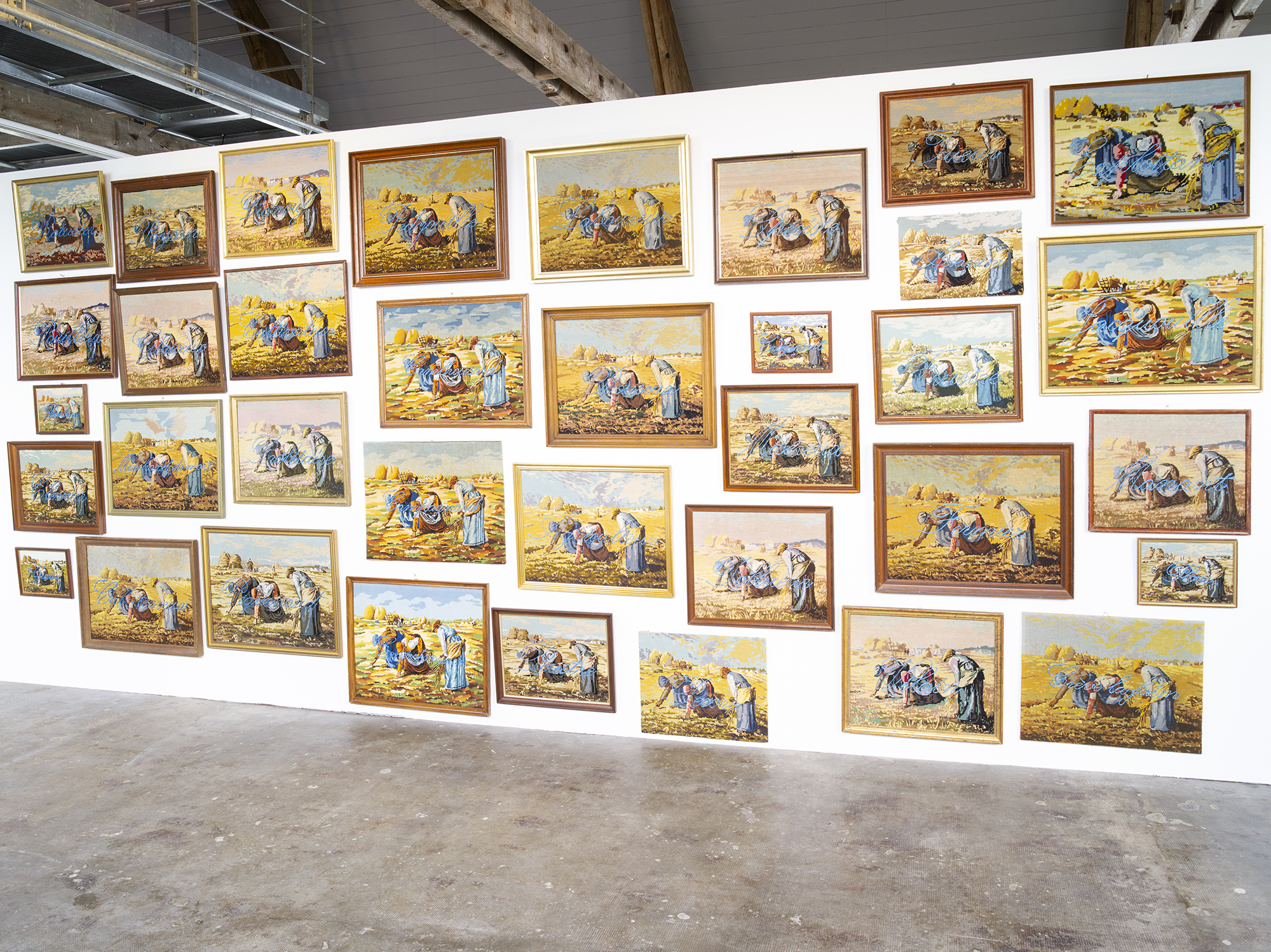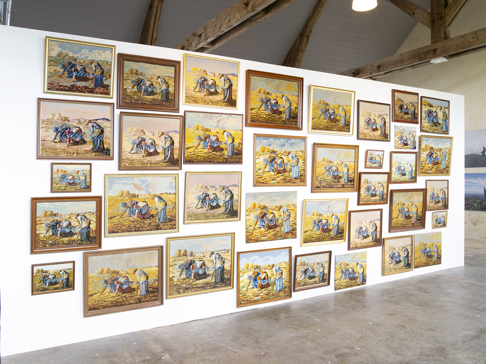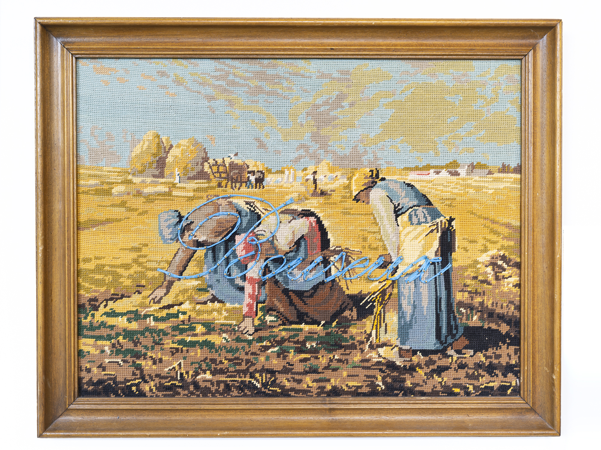Série de canevas « Glaneuses » de Millet avec inscription en ficelle bleue clouée,
