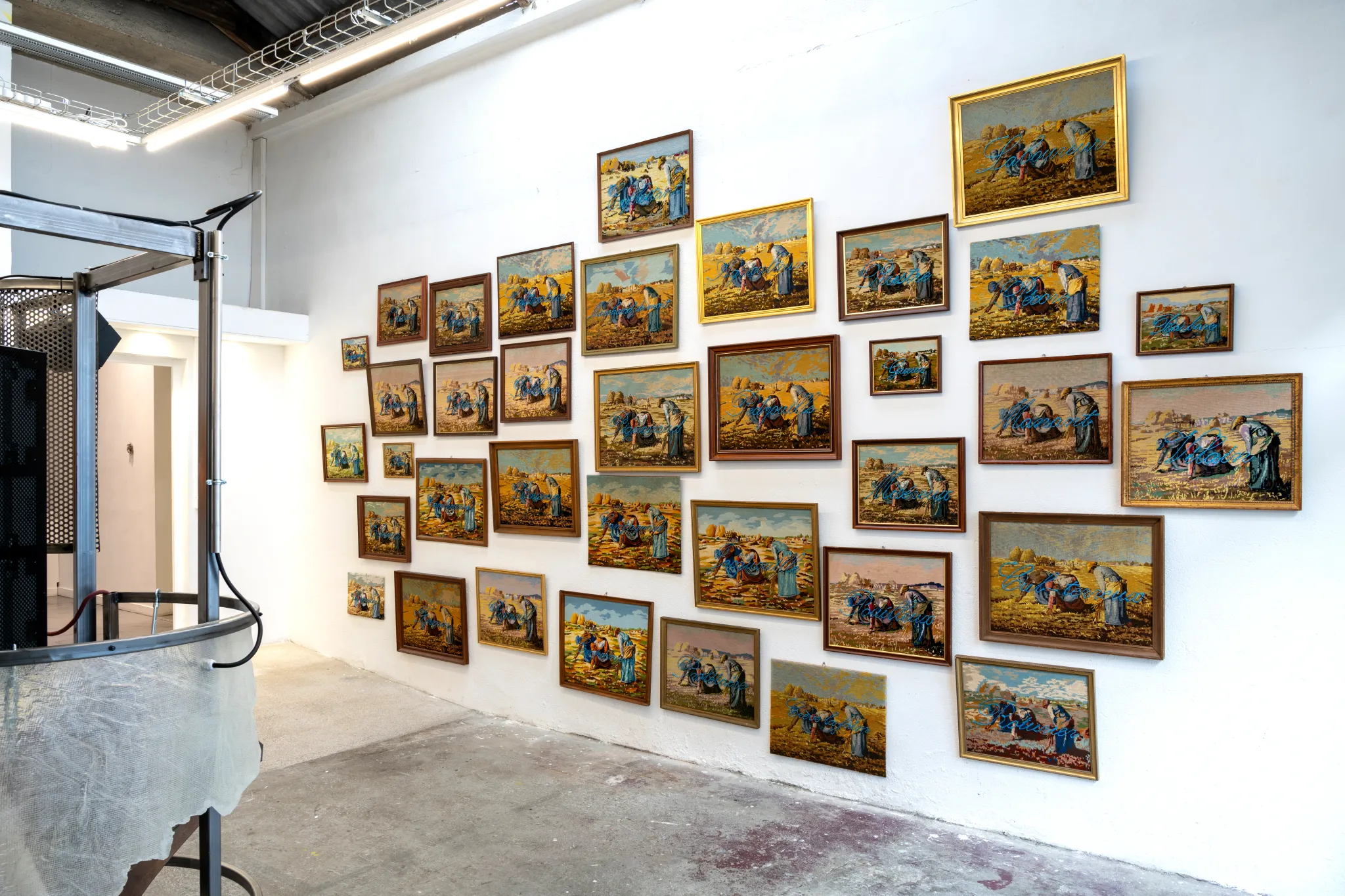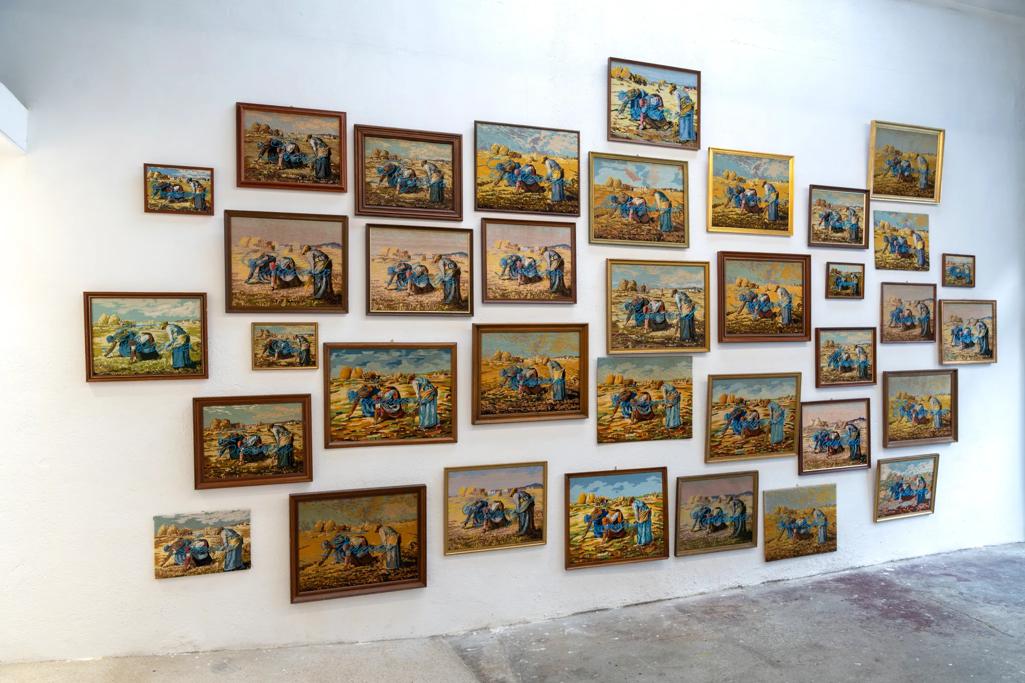 Série de canevas « Glaneuses » de Millet avec inscription en ficelle bleue clouée,