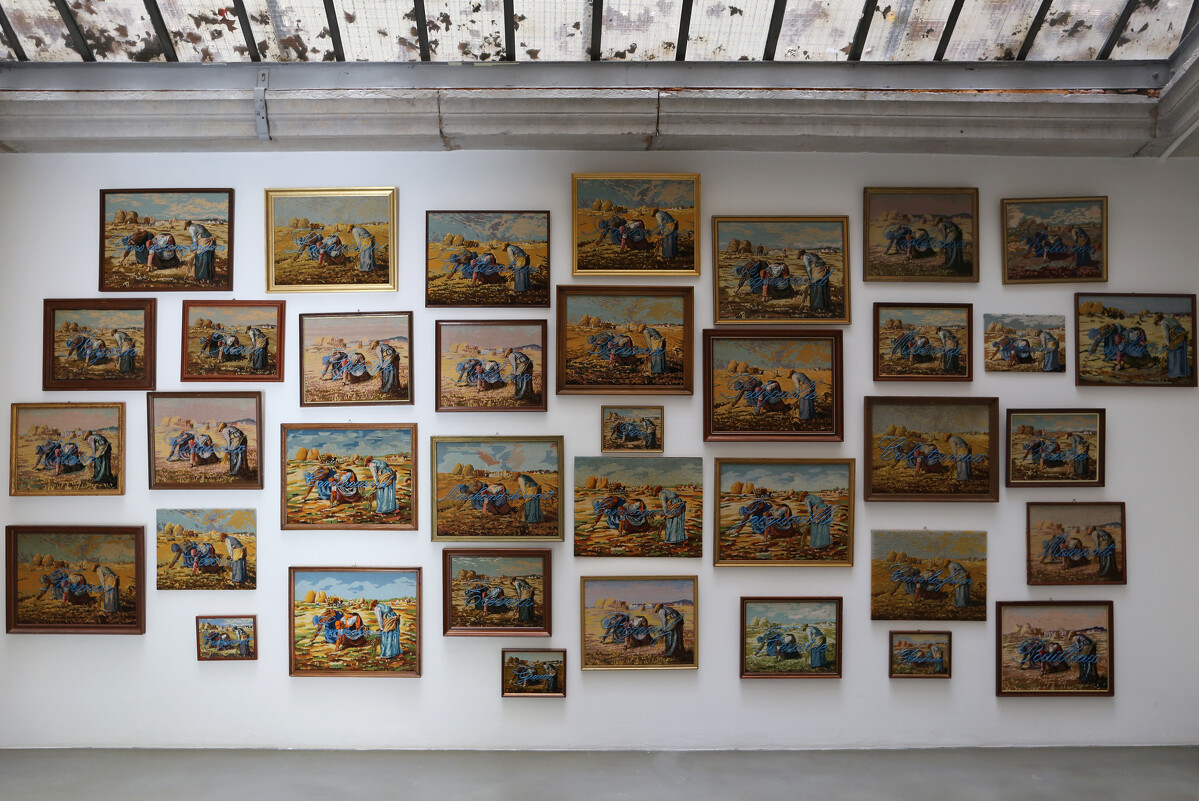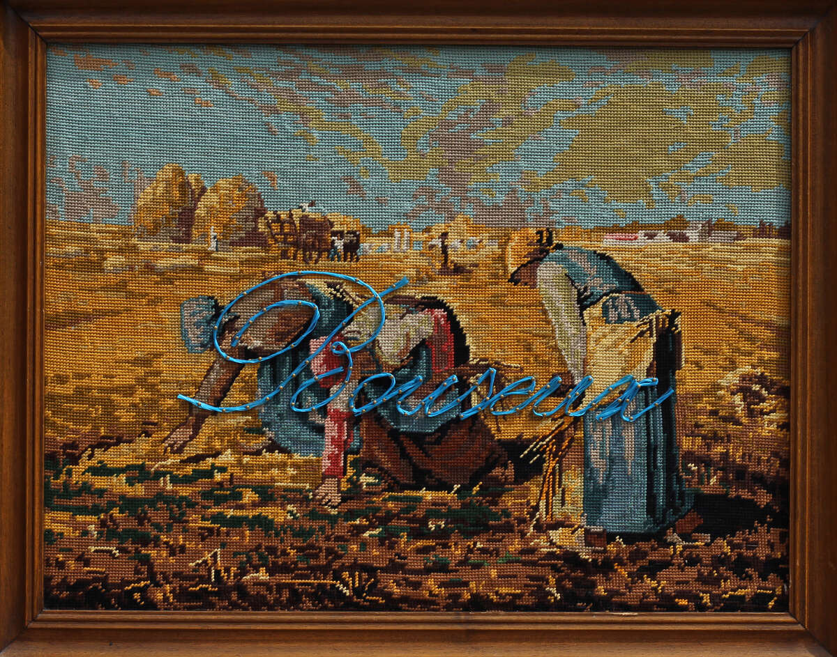 Série de canevas « Glaneuses » de Millet avec inscription en ficelle bleue clouée,