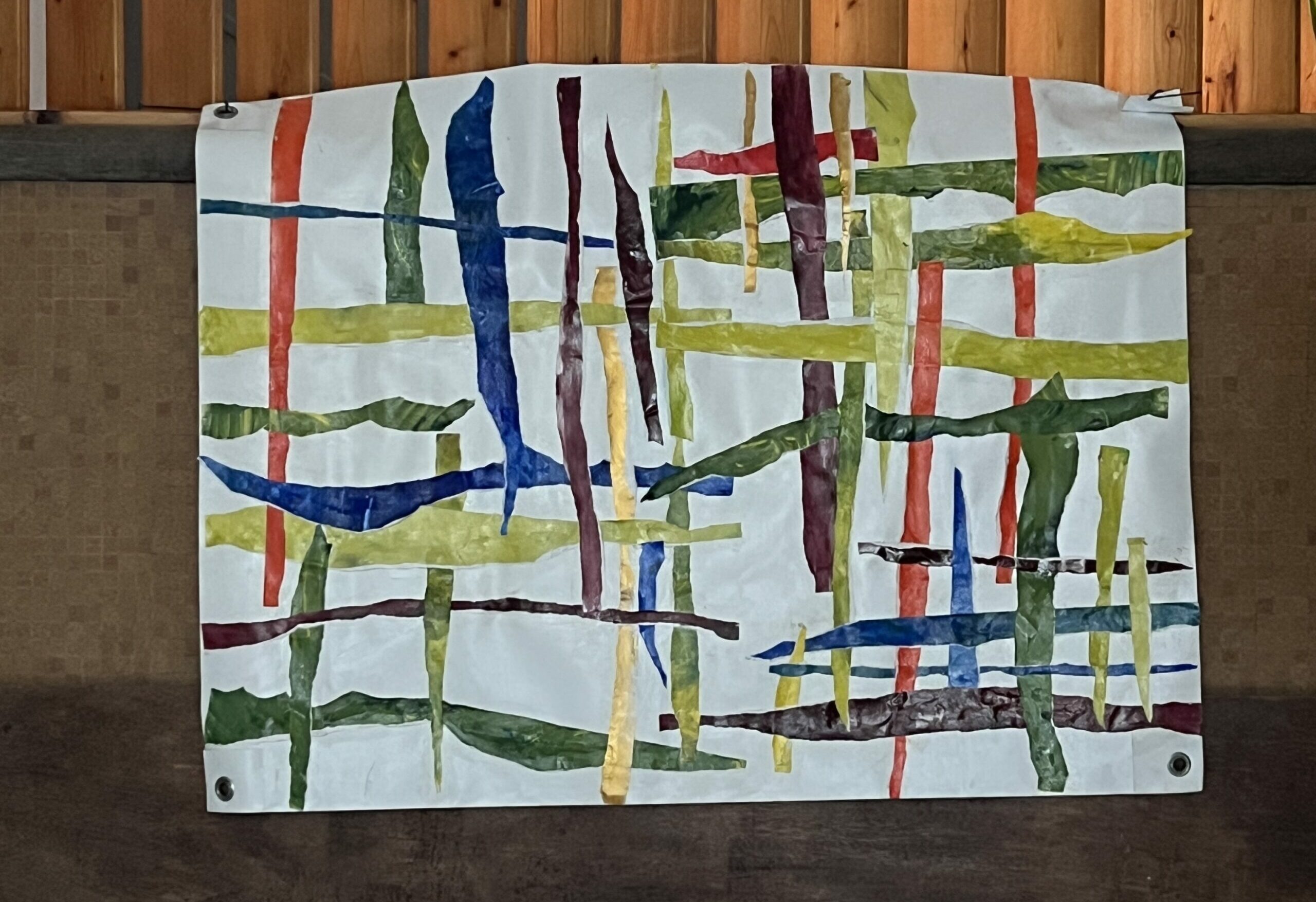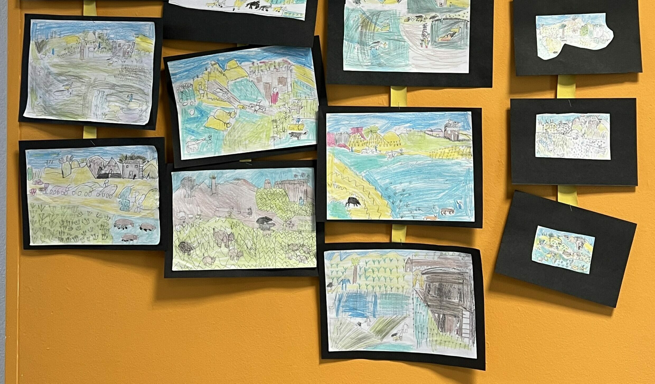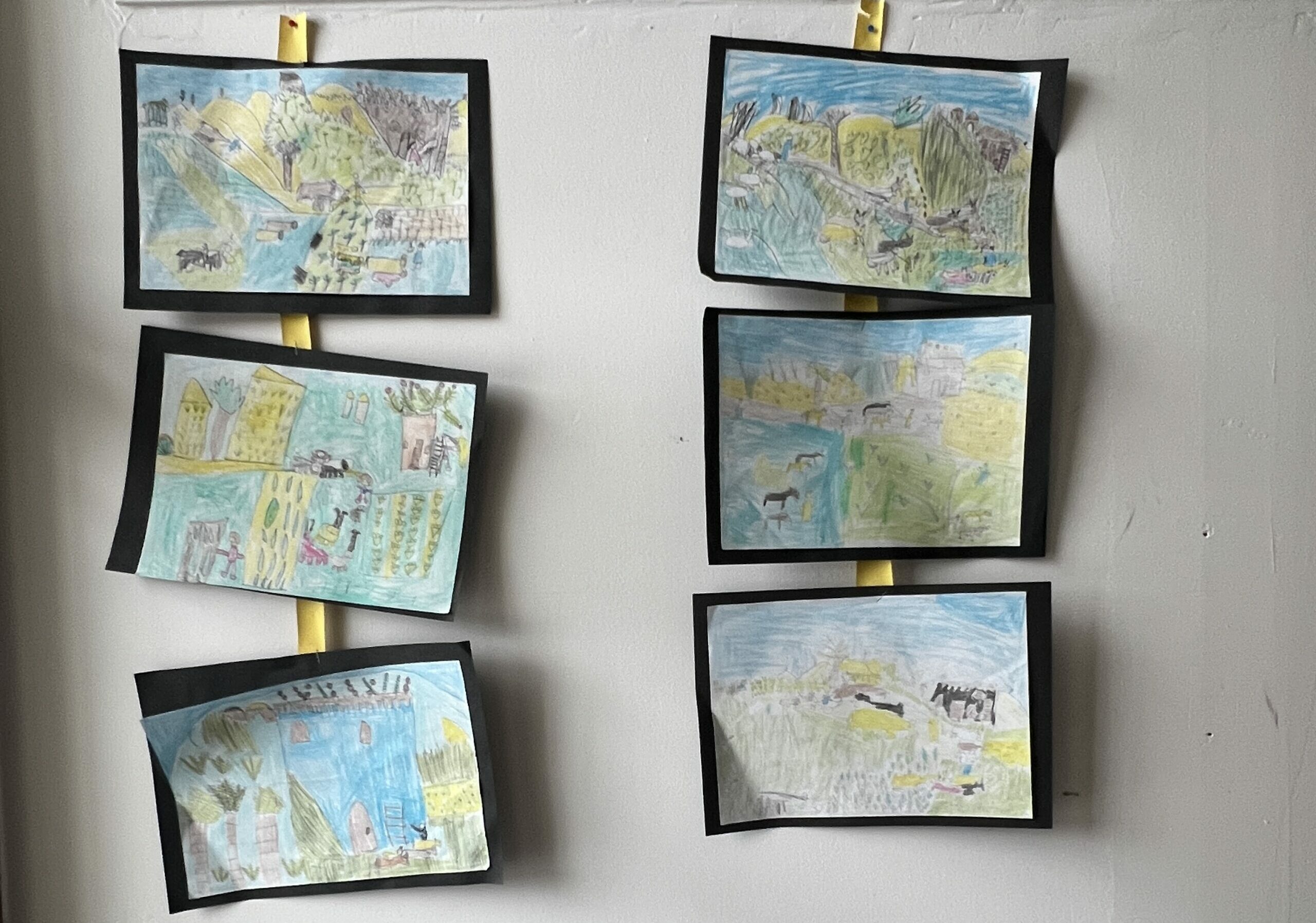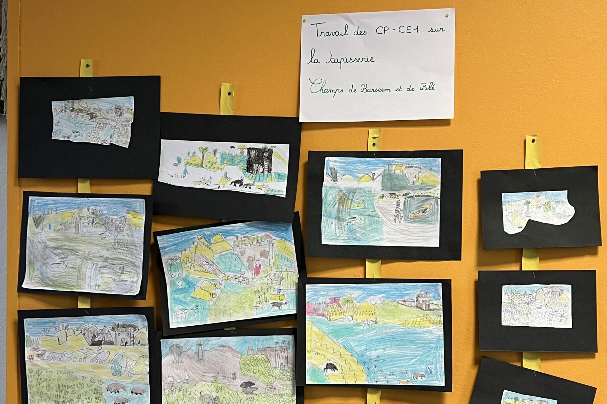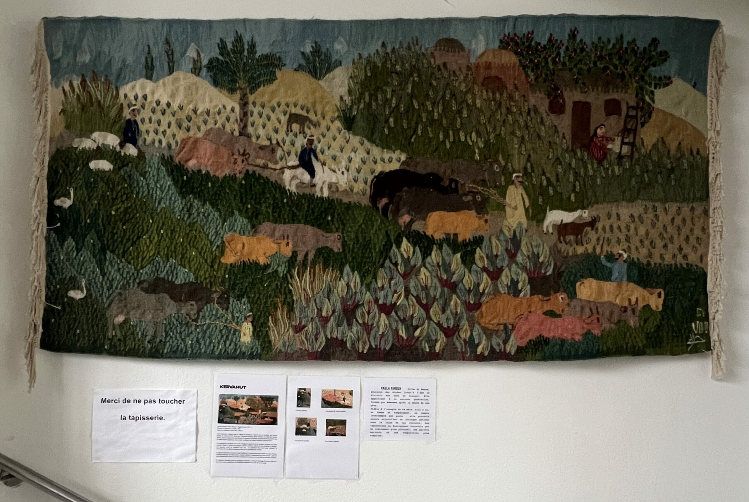 Cette tapisserie, réalisée dans le village de Harrania, s’inscrit dans la tradition des ateliers fondés au milieu du XXᵉ siècle par l’architecte Ramsès Wissa Wassef. Ce centre de création textile visait à renouer avec des formes d’expression artisanale profondément enracinées dans la culture rurale égyptienne, tout en leur conférant une portée artistique contemporaine. La composition représente une scène villageoise agricole où les animaux occupent une place centrale. Bœufs et vaches aux pelages colorés, moutons, chèvres et oies peuplent le paysage. Les hommes vivent en symbiose avec eux : ils mobilisent leur force pour labourer, se nourrissent de leur chair et partagent avec eux le quotidien des champs.