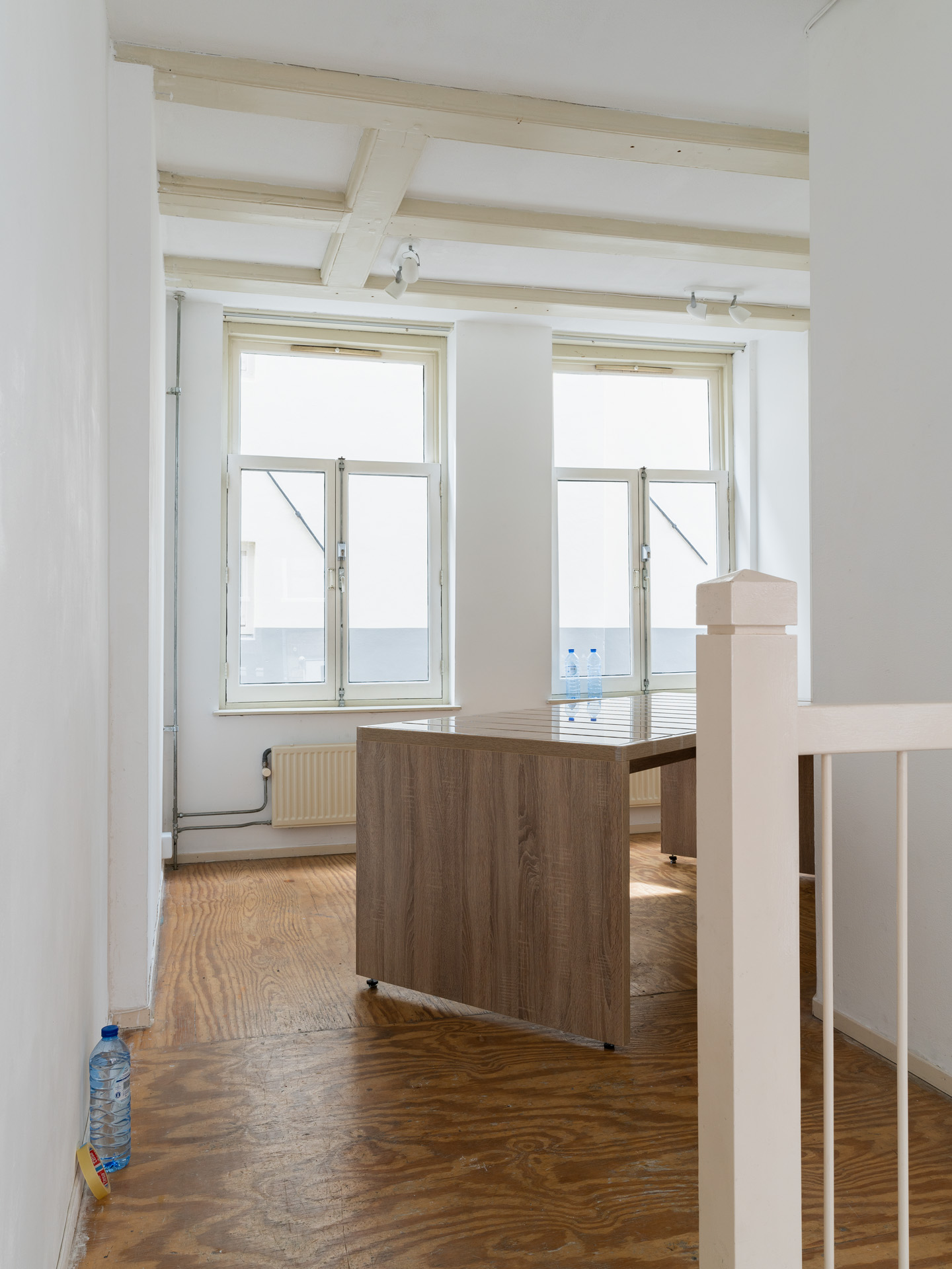 em>Sans titre, ruban adhésif, bouteilles d’eau, bureau ou espace de travail ( (2014)