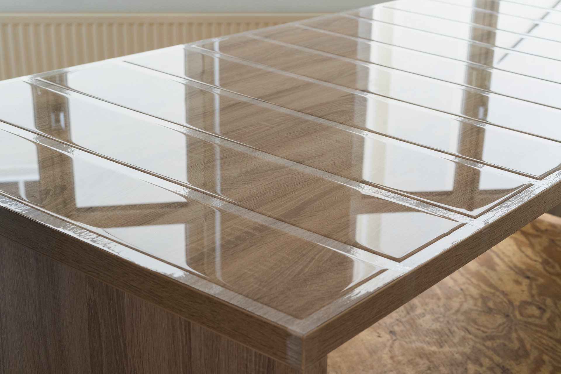 Ruban adhésif, bouteille d’eau, table ou espace de travail.
