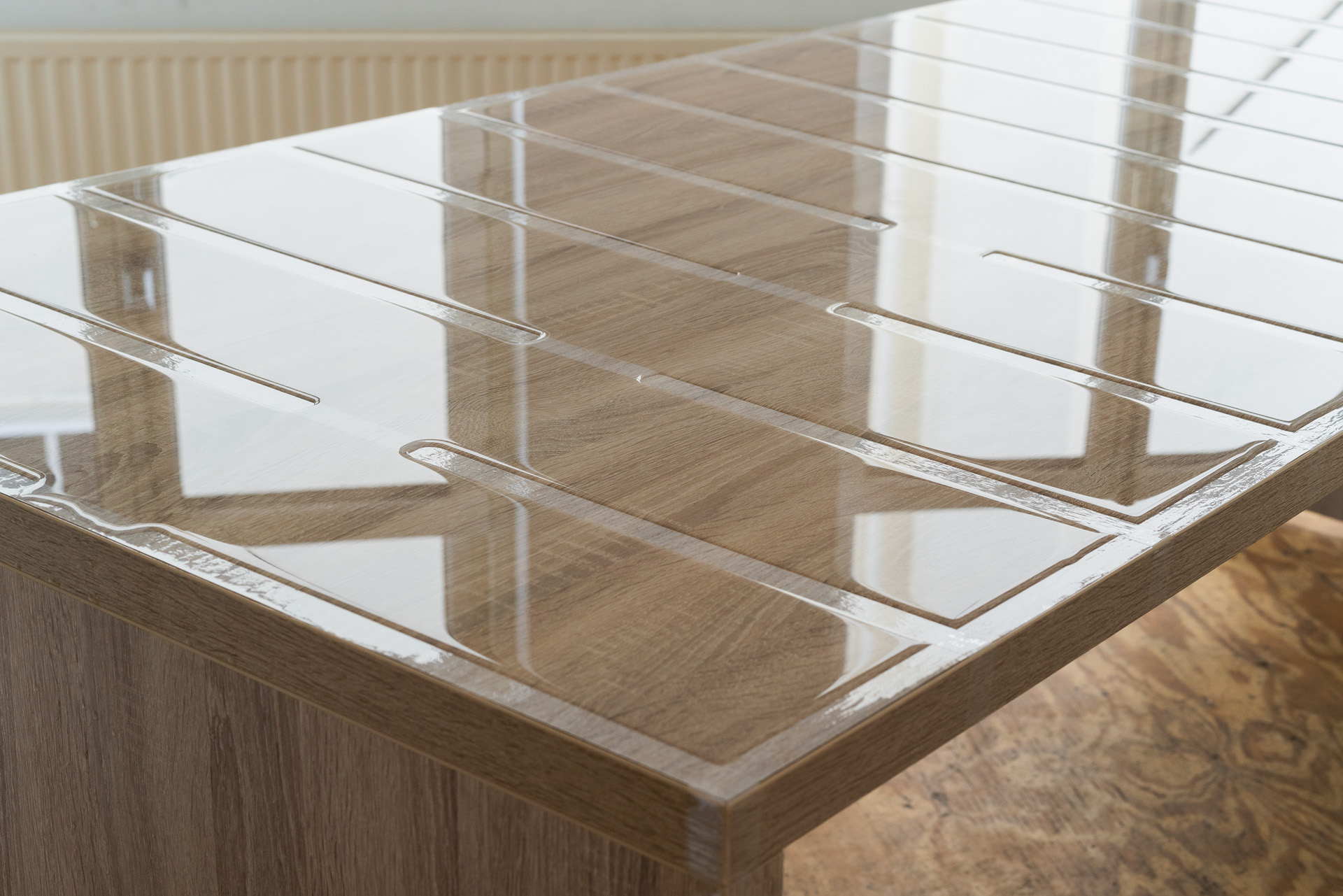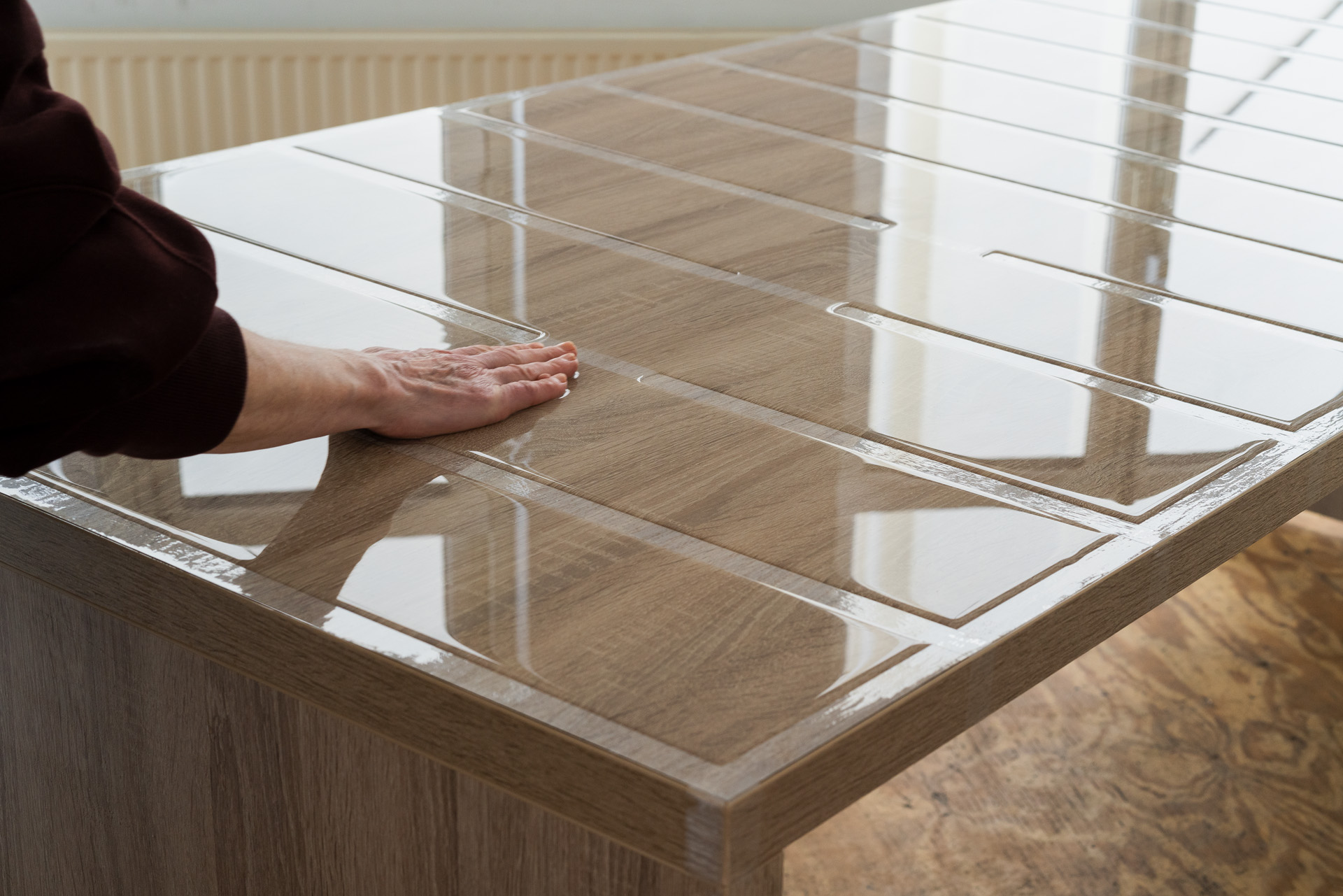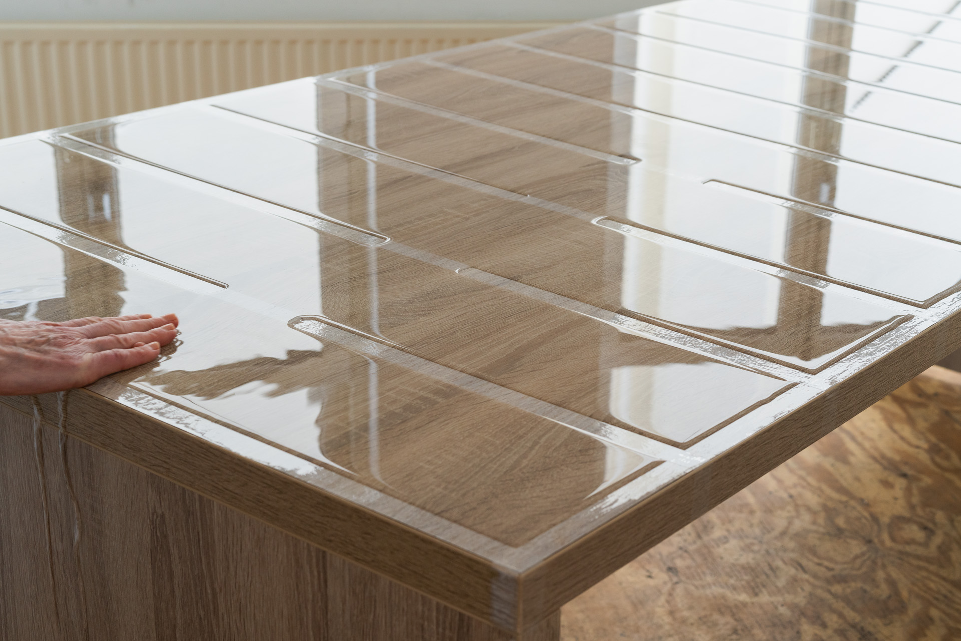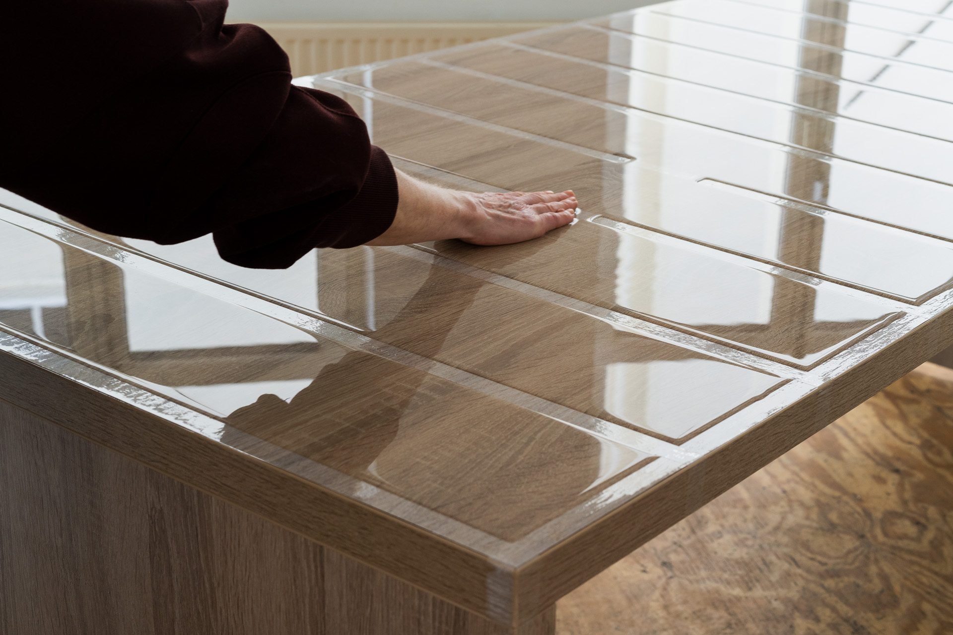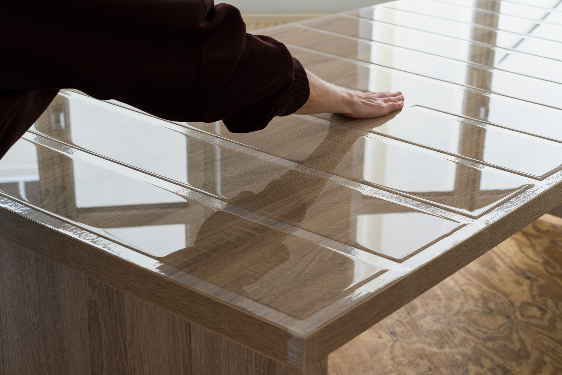Pour l’œuvre Sans titre, ruban adhésif, bouteilles d’eau, bureau ou espace de travail (2014), la surface d’un bureau est encadrée de ruban adhésif, également collé dans le sens de la longueur en bandes espacées d’une largeur de main. De l’eau est versée soigneusement entre ces bandes. Grâce à la capillarité, elle se maintient légèrement au-dessus des bandes de ruban adhésif environnantes.L’artiste placé en bout de table pose sa main sur l’eau et en tire lentement un filet vers elle avant de laisser l’eau retourner progressivement à sa position initiale.